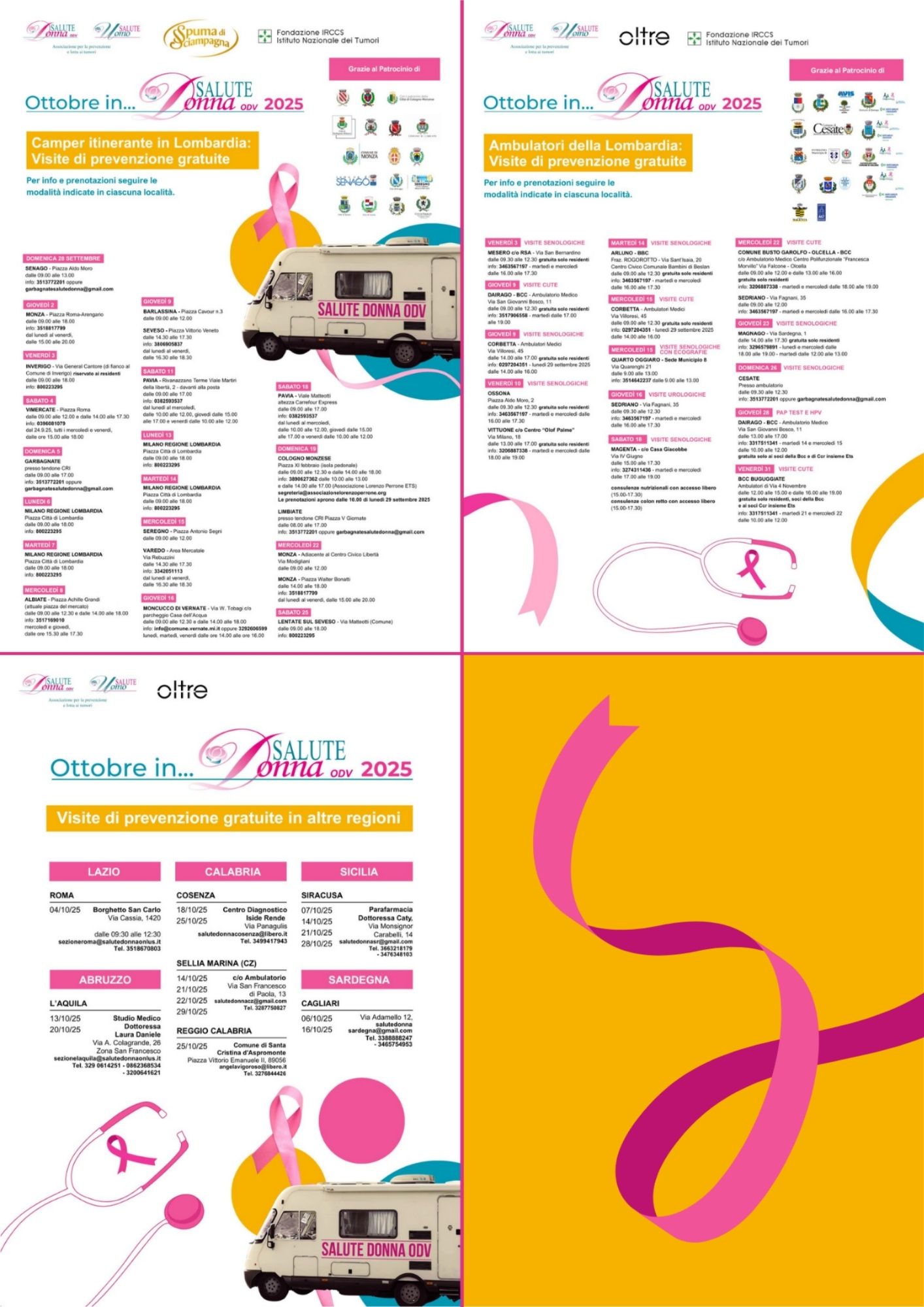 Nel mese della prevenzione Salute Donna da 10 anni propone l’iniziativa “Ottobre in salute”. Un viaggio lungo un mese con specialisti e volontari, un’esperienza unica che consente di offrire gratuitamente visite specialistiche al seno e, in alcune tappe, anche la spirometria. Lo scopo è quello di portare la prevenzione in tanti piccoli e grandi centri della Lombardia e anche in altre Regioni con camper attrezzati. Nel 2024 sono state effettuate 1685 visite in 18 piazze italiane.